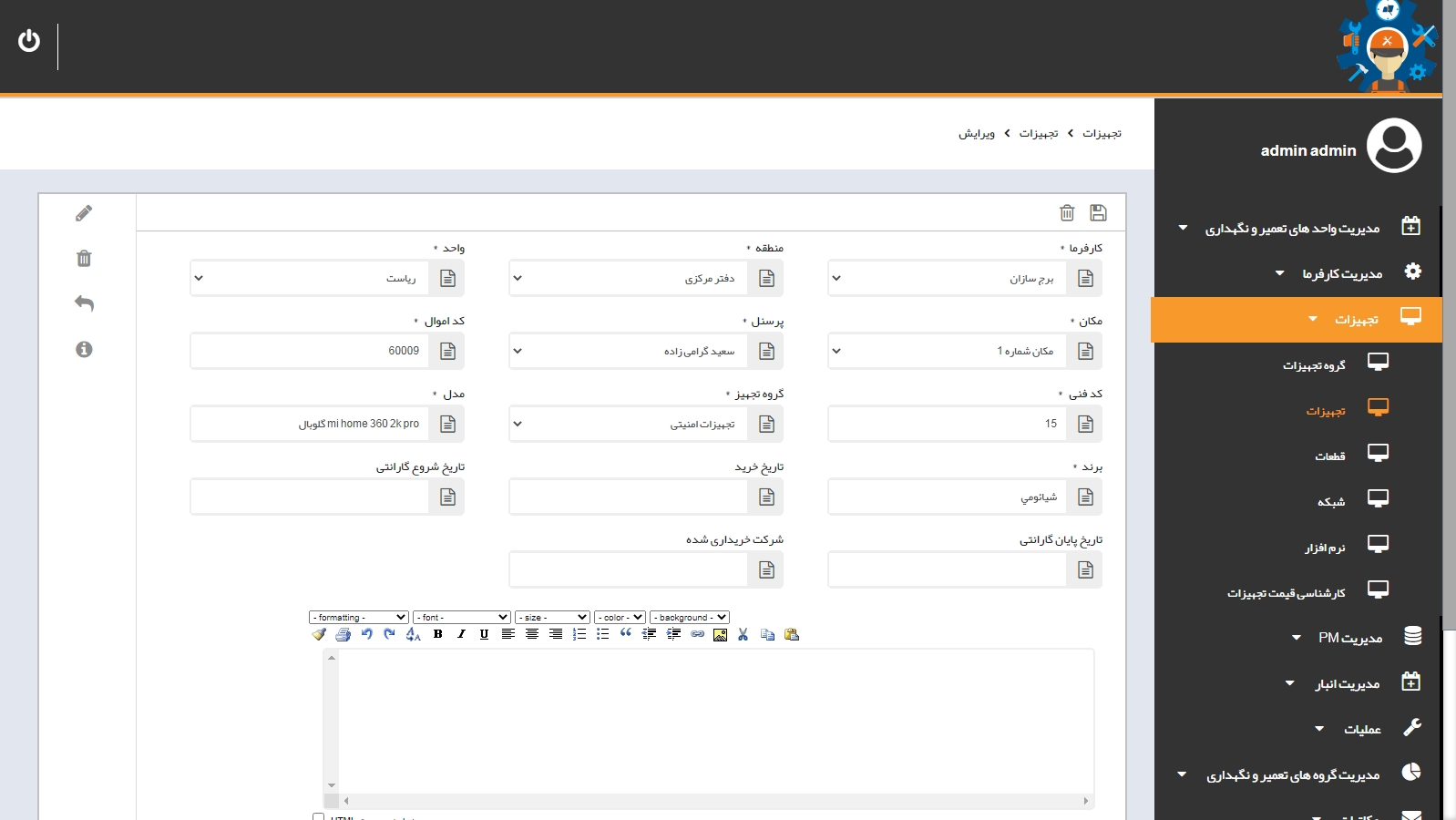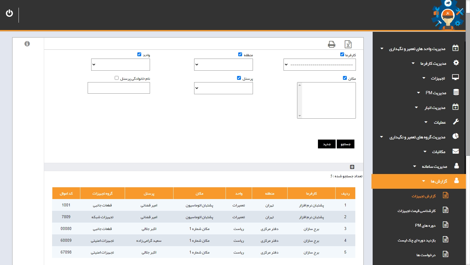 امکانات ناحیه مدیریت سامانه تعمیر و نگهداری